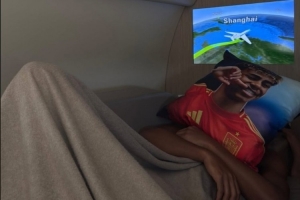 亚马尔社媒晒出乘坐飞机前往上海照片,他在飞机上小憩,脸上盖着自己形象的抱枕,据悉现在他已经抵达上海虹桥机场。